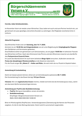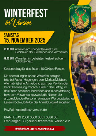 Ein besonderer Dank gilt allen, die zum Gelingen des Abends beigetragen haben – sei es durch Organisation, helfende Hände oder einfach durch ihre gute Laune. Der Bürgerschützenverein Versen blickt mit Freude auf diesen traditionsreichen Abend zurück und freut sich schon jetzt auf das nächste gemeinsame Fest.
