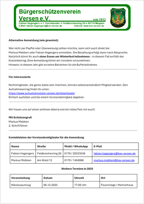 Nichtmitglieder, die dabei sein möchten, können jederzeit Mitglied werden. Den Aufnahmeantrag findet ihr hier: www.schuetzenverein-versen.de/downloads.